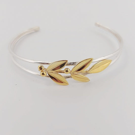 Olive Leaves Bracelet, Silver Dual-Band Cuff with Gold Plated Greek Design, Elegant Leaf Motif