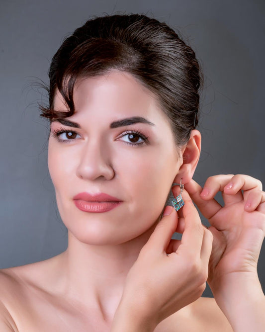 Sterling Silver Blue Opal Dangle Earrings: Greek Key Diamond Design