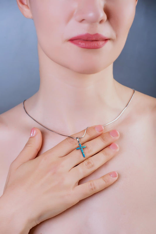 Sterling Silver 925 Blue Opal Necklace with Greek Key Meander Design