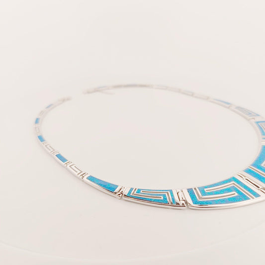 Sterling Silver Blue Opal Necklace with Greek Key Meander Design