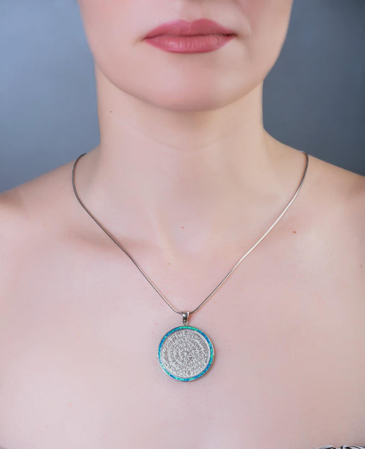 Sterling Silver Phaistos Disc Pendant: Blue Opal Inlay, Ancient Greek Design