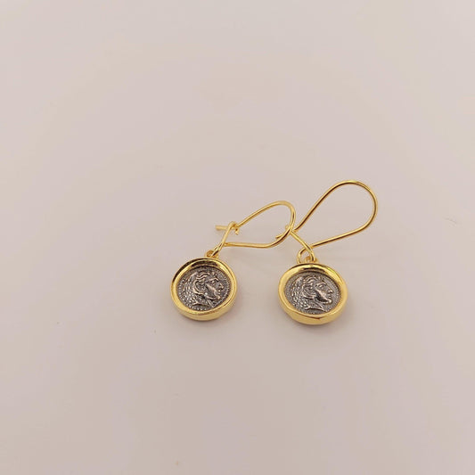 Hercules Coin Dangle Earrings, Silver Gold Plated, Greek Mythology
