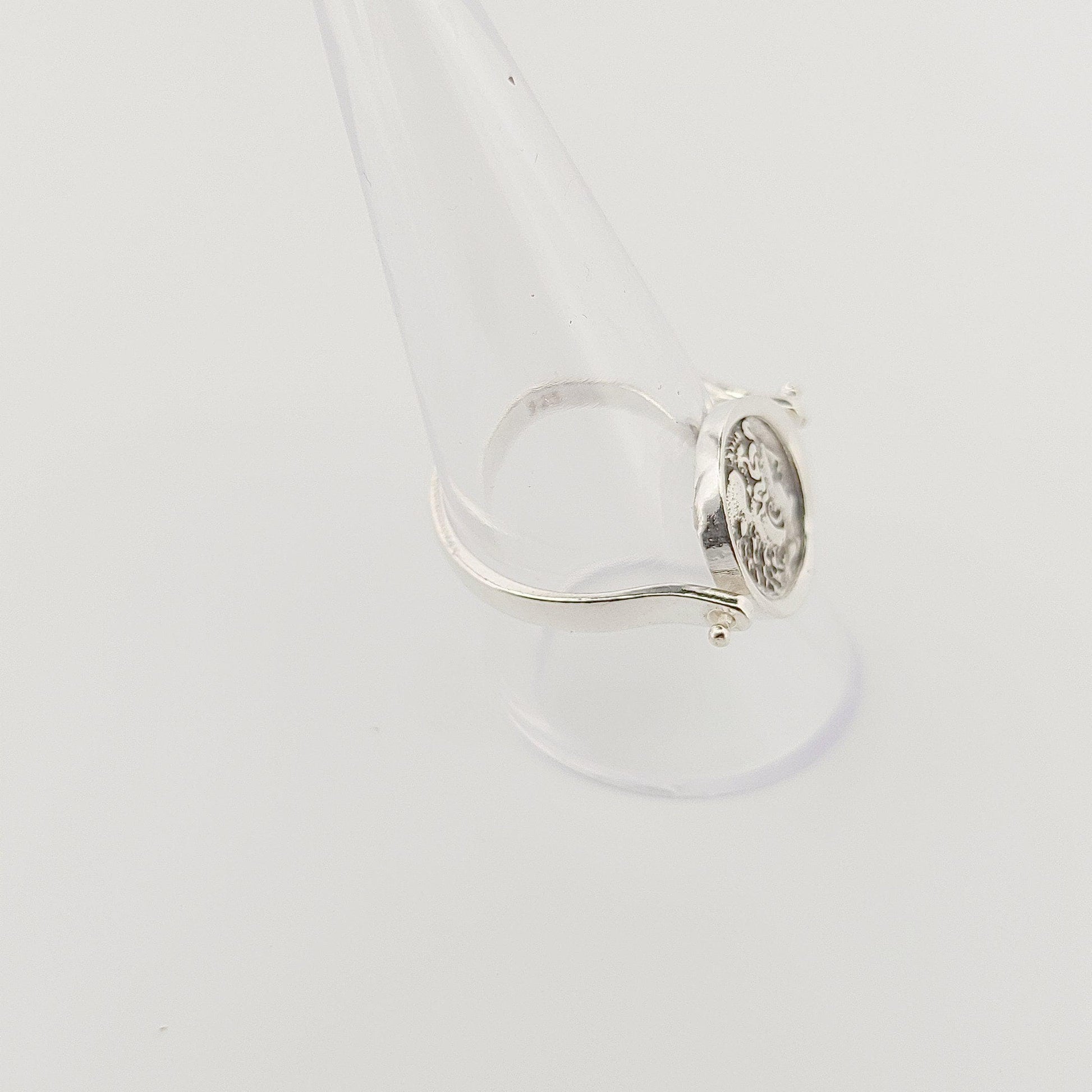 The ring showcases a detailed circular medallion that captures the essence of Hellenistic artistry, mounted on a sleek silver band.