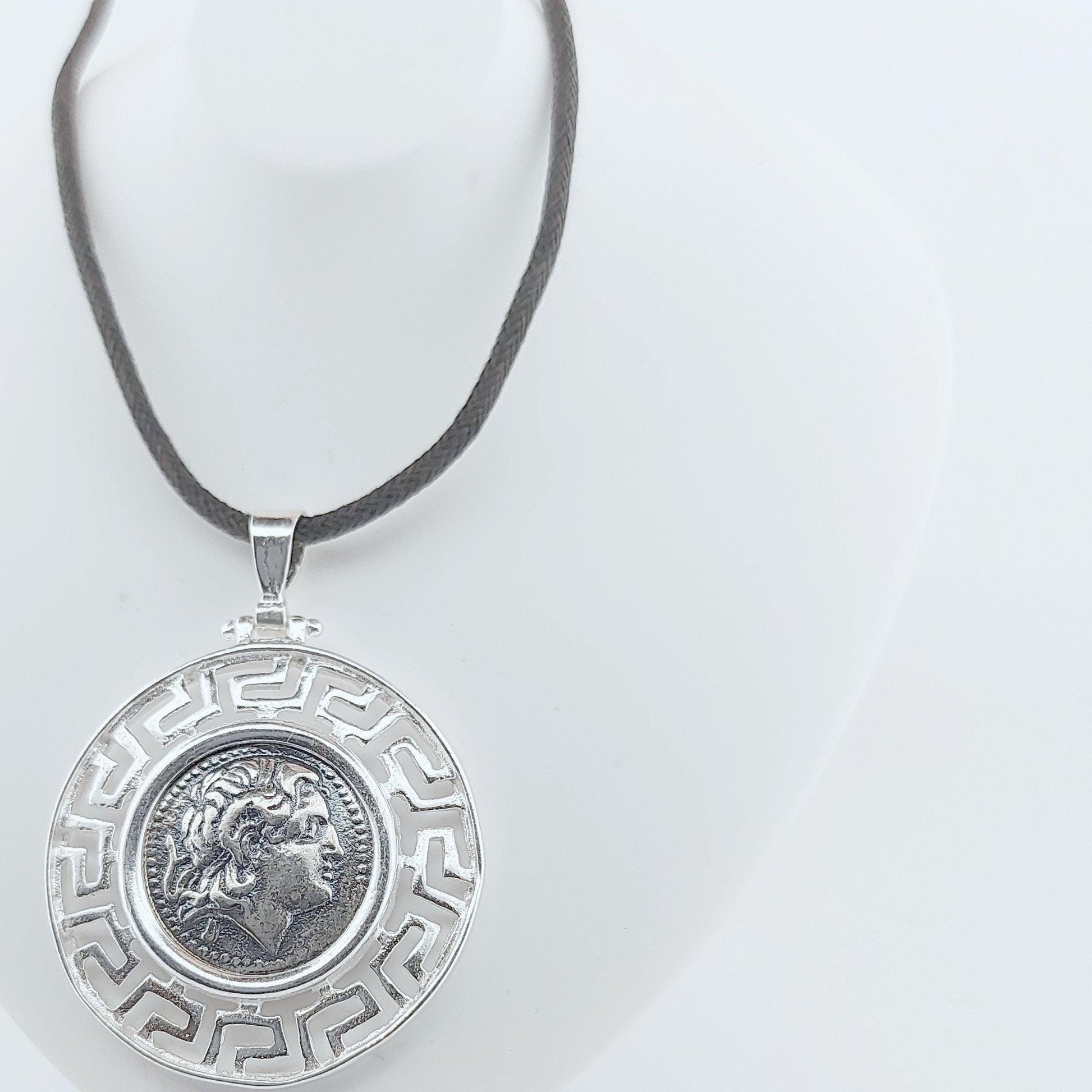This exquisite silver pendant features a detailed reproduction of an ancient coin depicting Alexander the Great, the legendary Macedonian ruler. The classic profile portrait is encircled by a striking Greek key pattern border, creating an elegant medallion design.