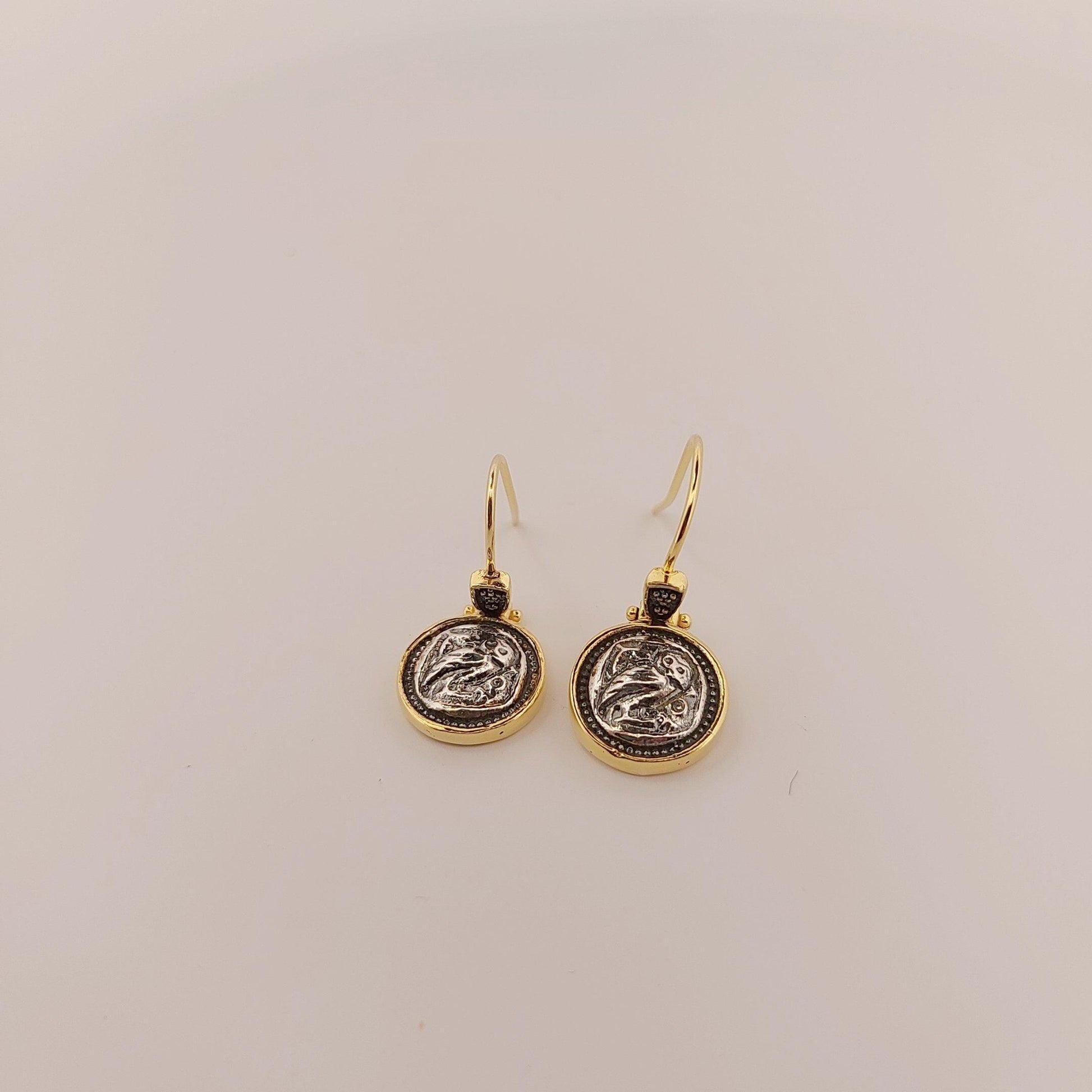 These exquisite dangle earrings showcase ancient Greek-inspired owl designs, beautifully crafted in a striking two-tone finish of silver and gold plating.