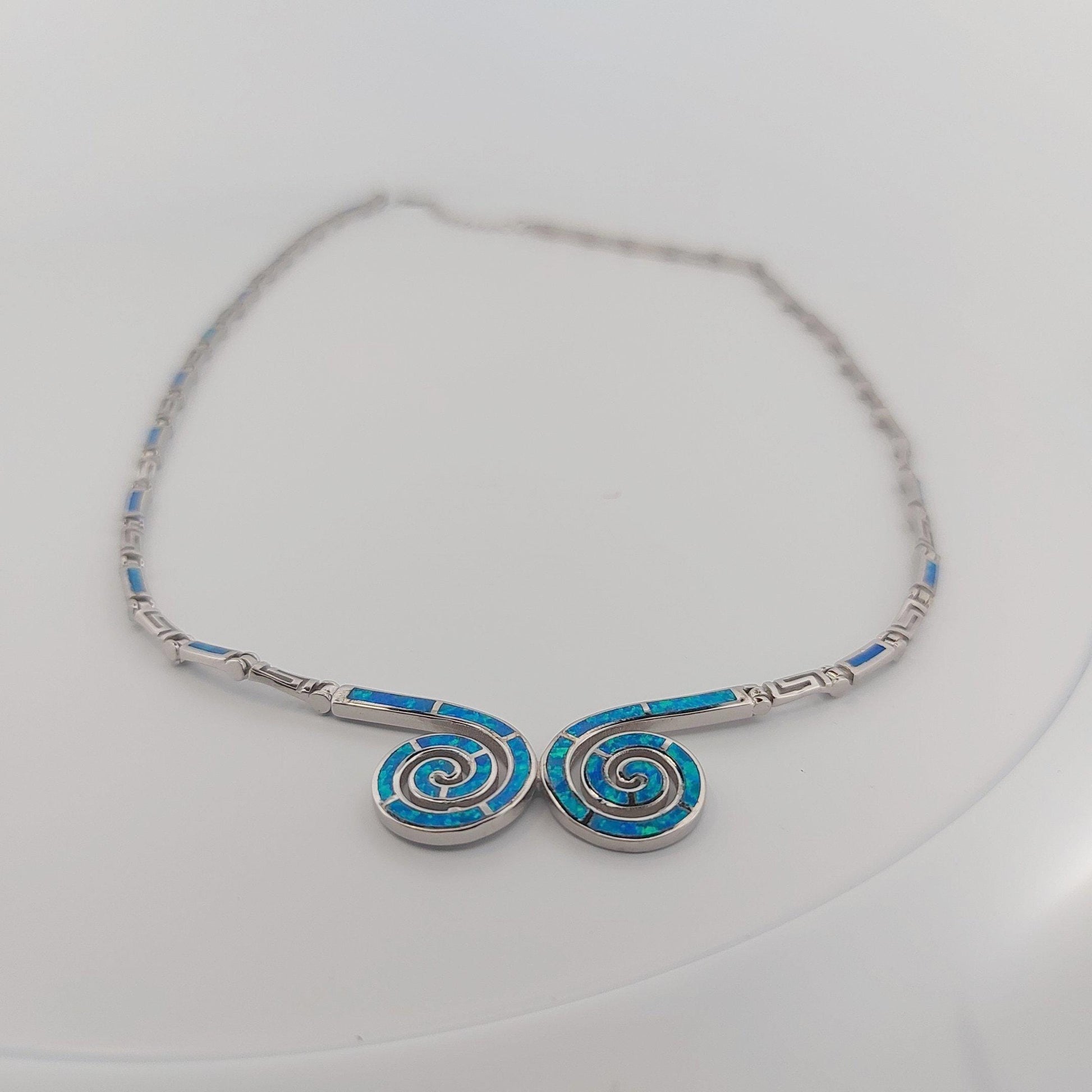 Blue Opal Double Spiral Necklace, Greek Key Meander Design