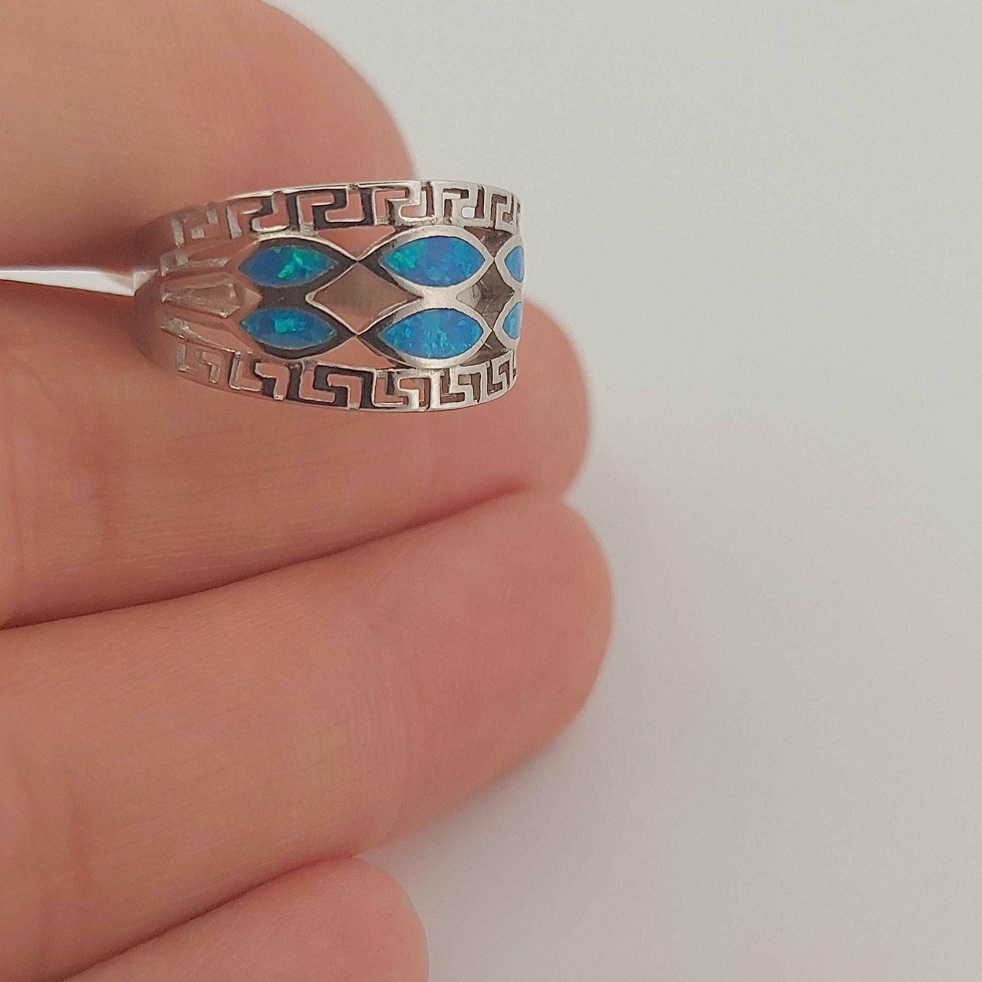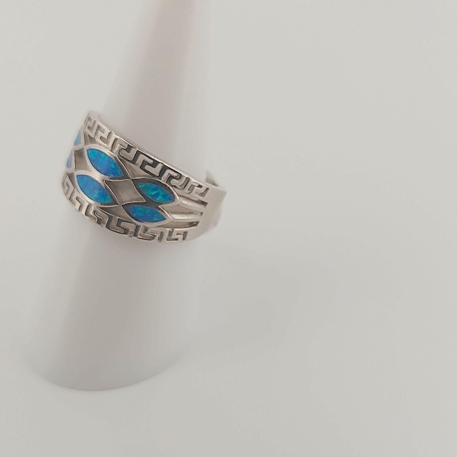 Blue Opal Ring Marquise Pattern, Sterling Silver Greek Key Meander Design