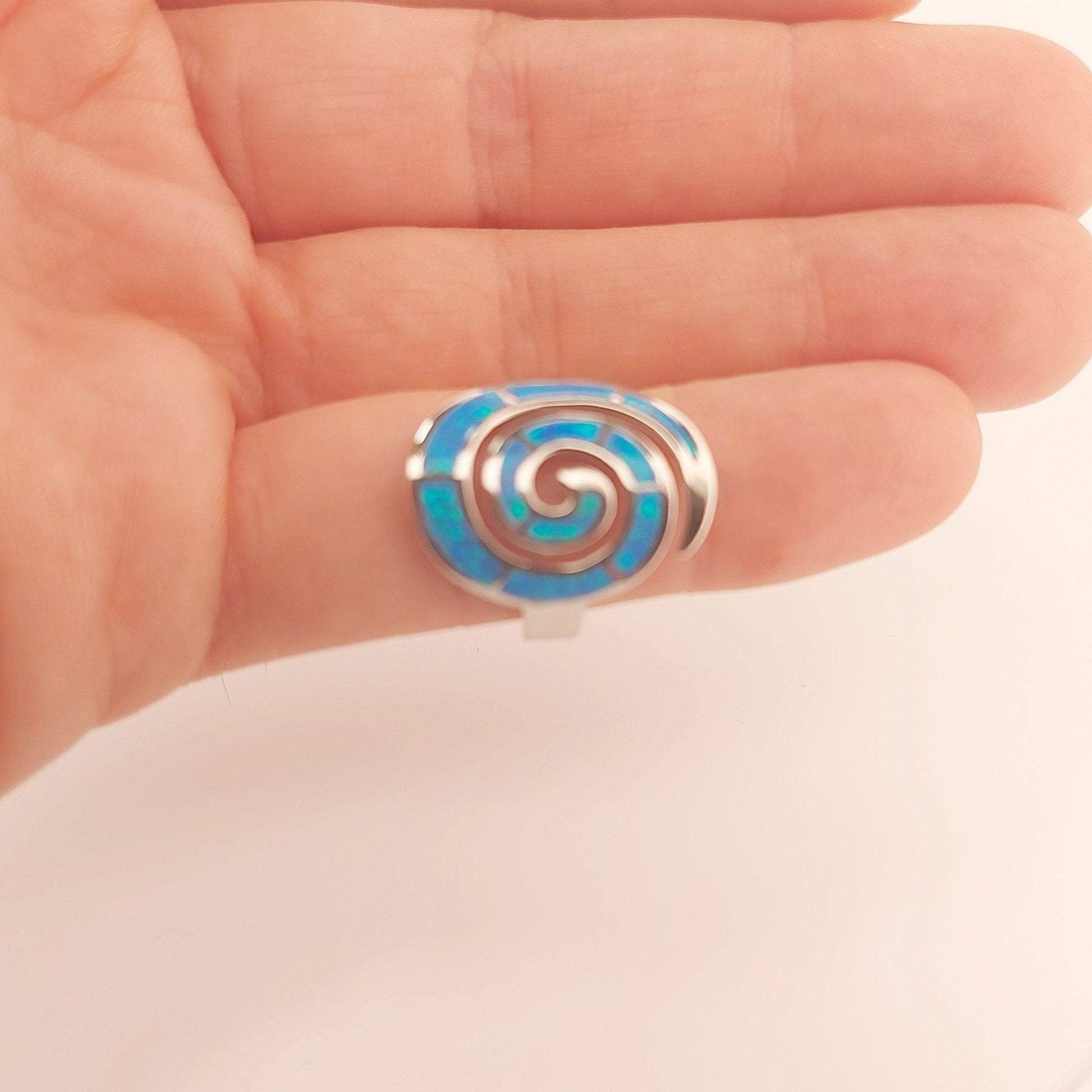 STUNNING INLAY: Beautiful blue opal stones carefully set within the spiral pattern create a striking contrast against the polished silver setting