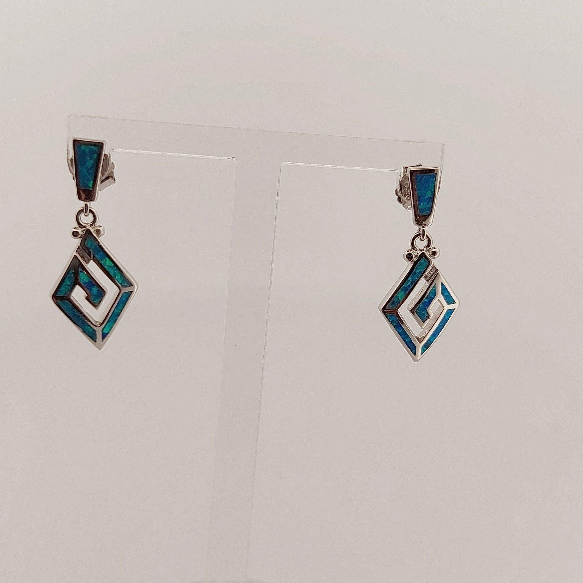 AUTHENTIC DESIGN: Sterling silver dangle earrings featuring a distinctive Greek meander (Greek key) pattern in a diamond shape with vibrant blue opal inlay