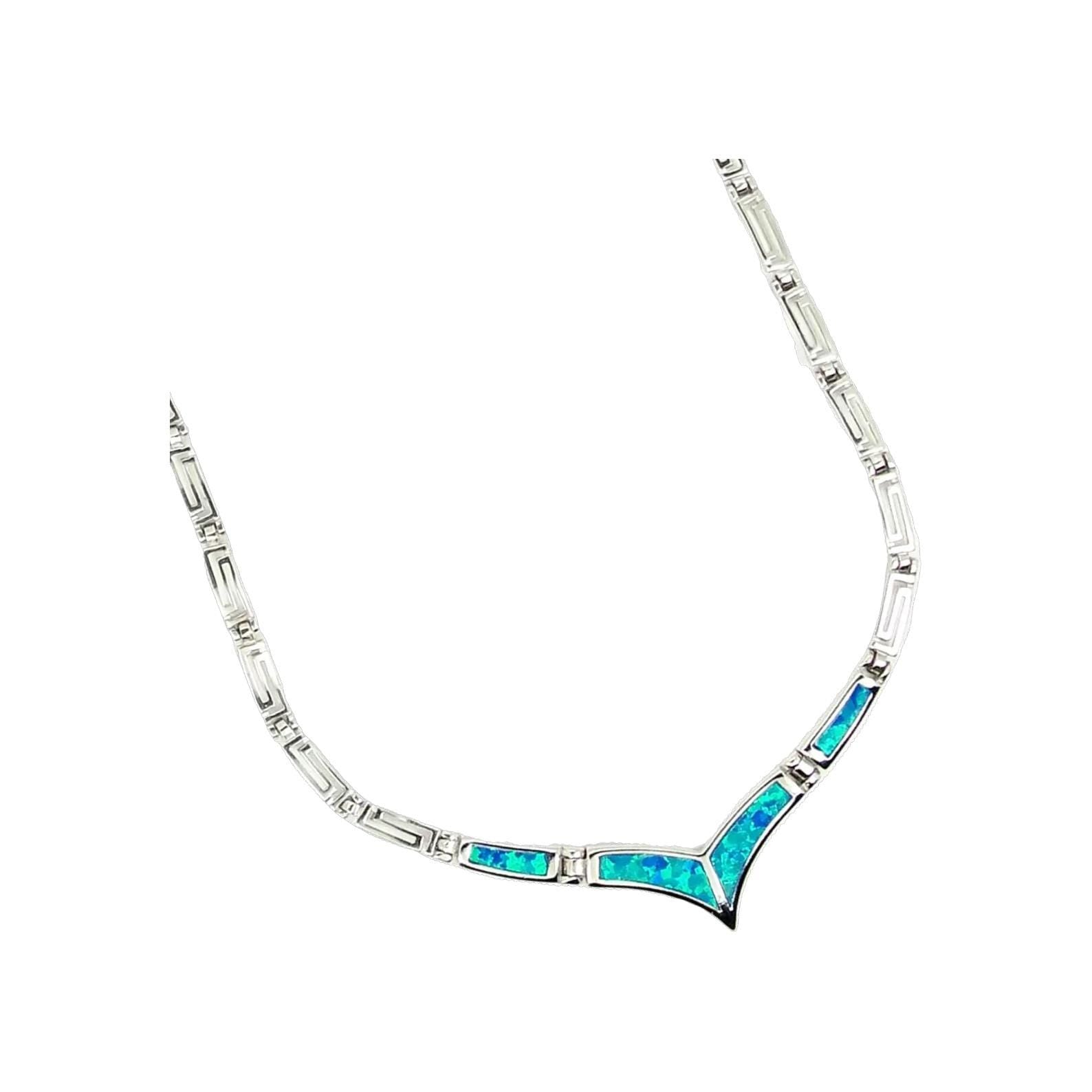 DESIGN ELEMENTS: Elegant V-shaped necklace featuring vibrant blue opal inlays complemented by a classic Greek key meander pattern in sterling silver