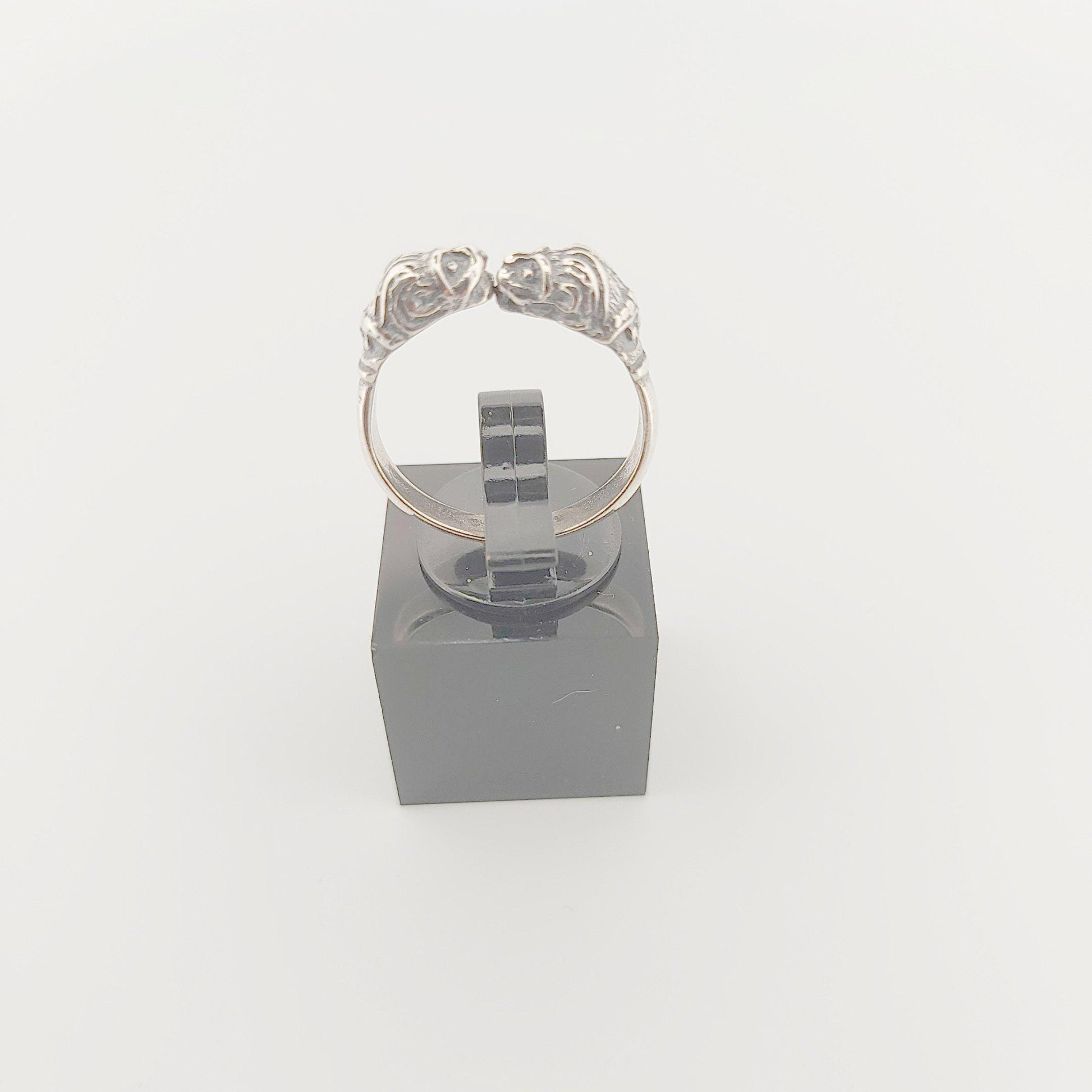 STATEMENT PIECE: Bold and eye-catching ring design with two opposing lion heads creating a dramatic open-ended style