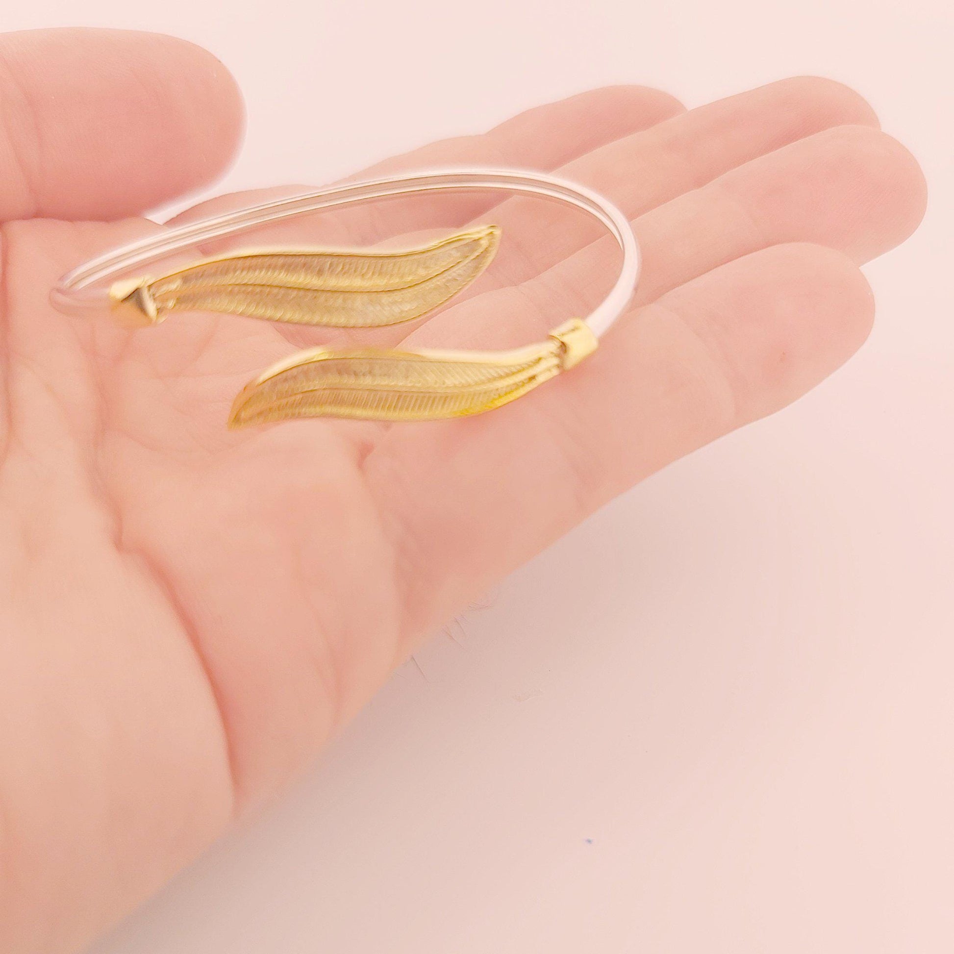 Made with silver and adorned with gold plating, this versatile piece combines classic and contemporary styles. The delicate leaf veining and natural curves make each bracelet a wearable piece of art. Perfect for both casual and formal occasions, this adjustable bangle adds a refined accent to any outfit.