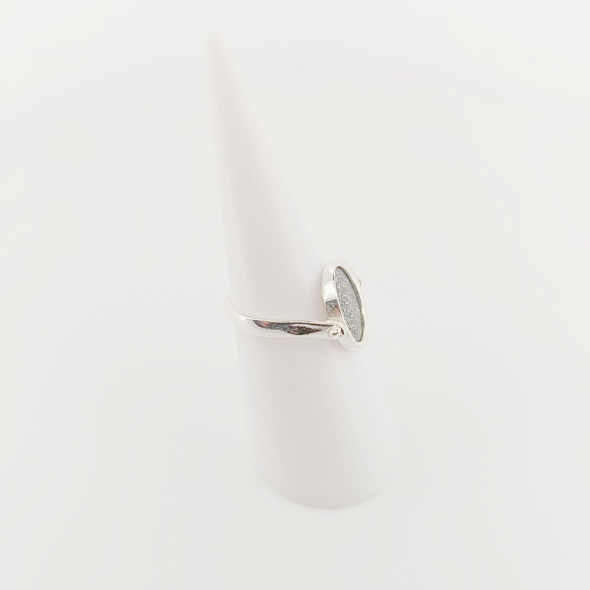 The ring showcases detailed engravings of the disc's enigmatic symbols in oxidized silver, creating a striking contrast against the polished sterling silver setting.