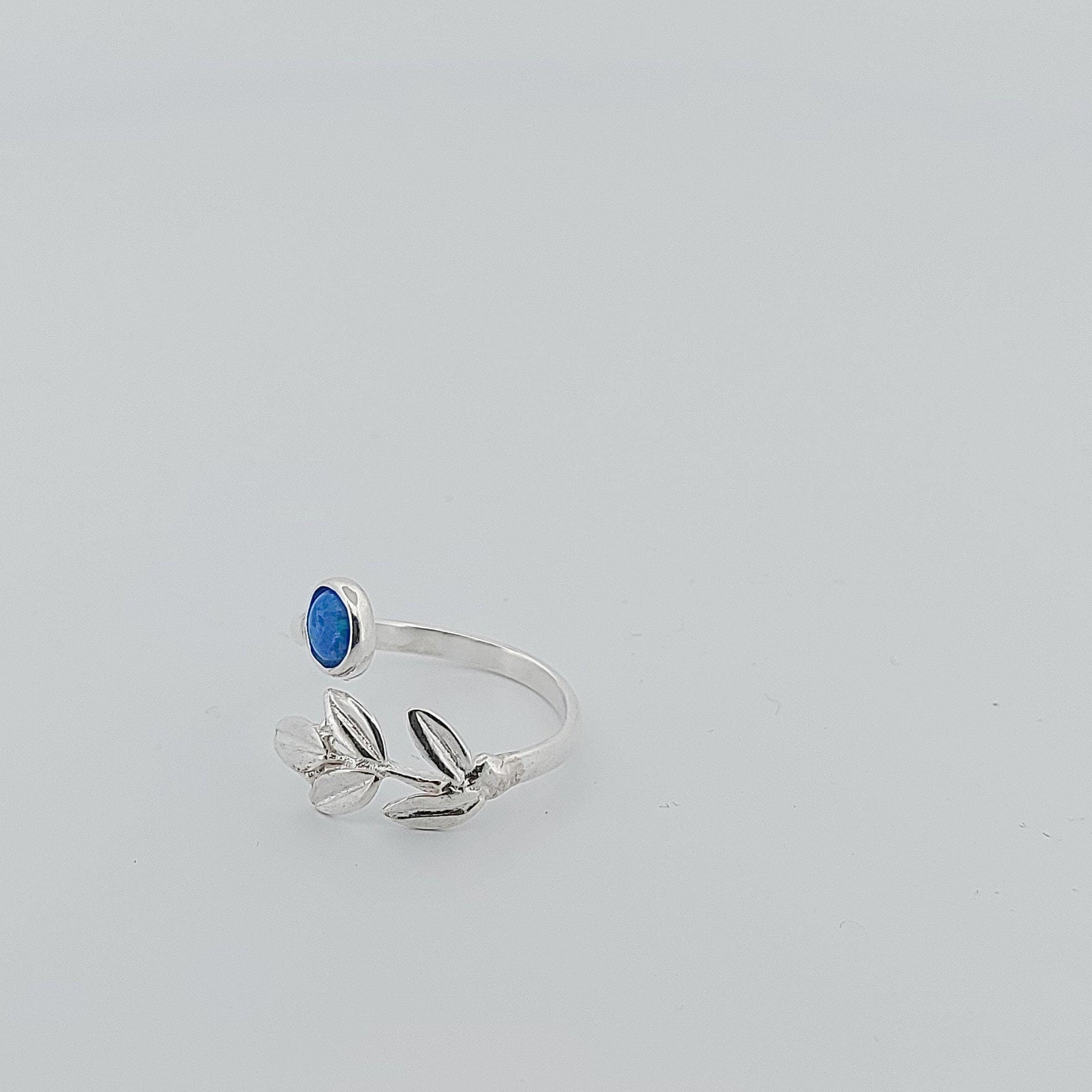 Embrace the timeless elegance of ancient Greek design with this exquisite sterling silver olive leaf ring featuring a stunning blue opal accent. The delicate leaf motif wraps gracefully around your finger, adorned with intricate detailing that captures the essence of Mediterranean artistry.