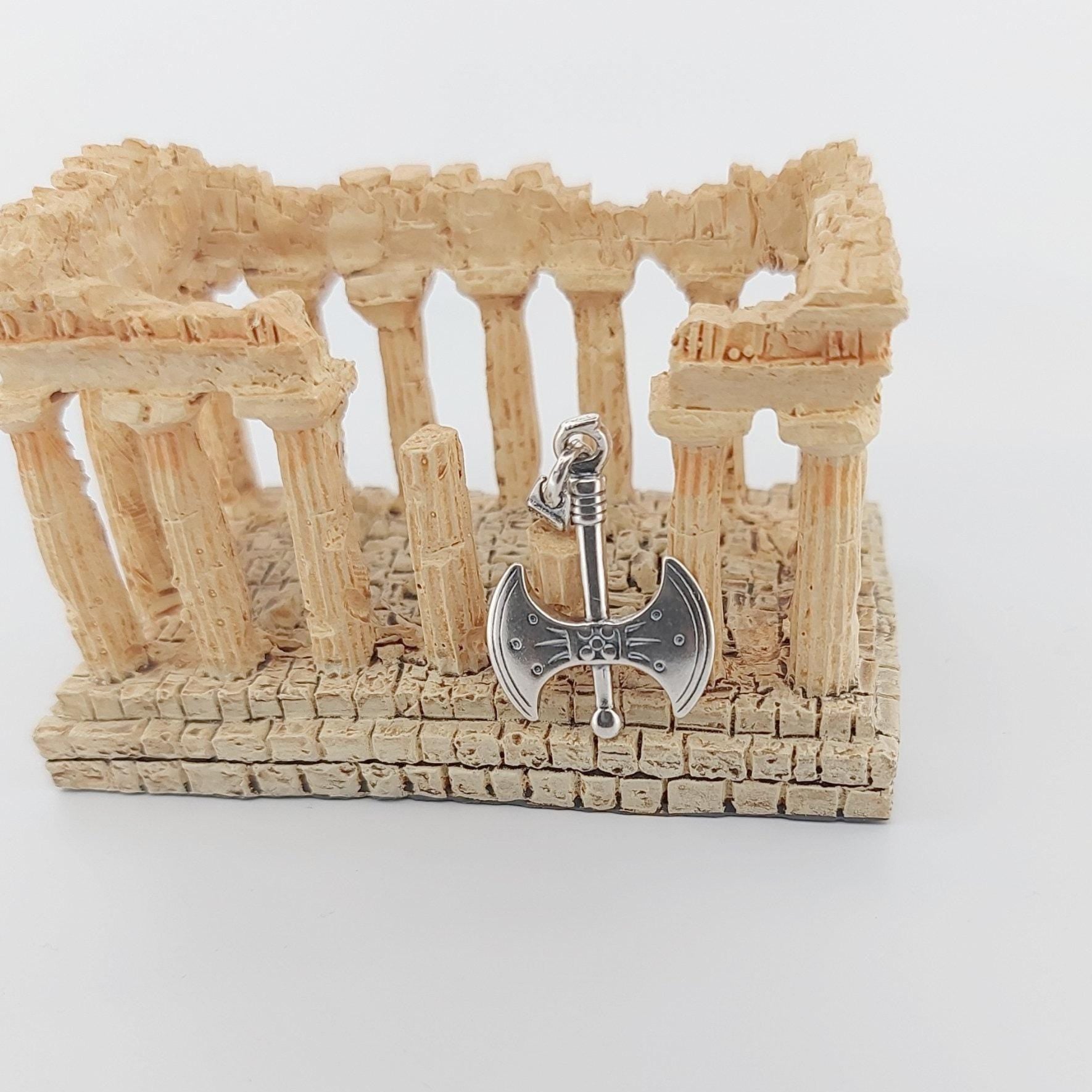 This exquisite double-axe pendant draws inspiration from the ancient Minoan civilization, featuring the iconic labrys design that held deep cultural significance in ancient Greece.