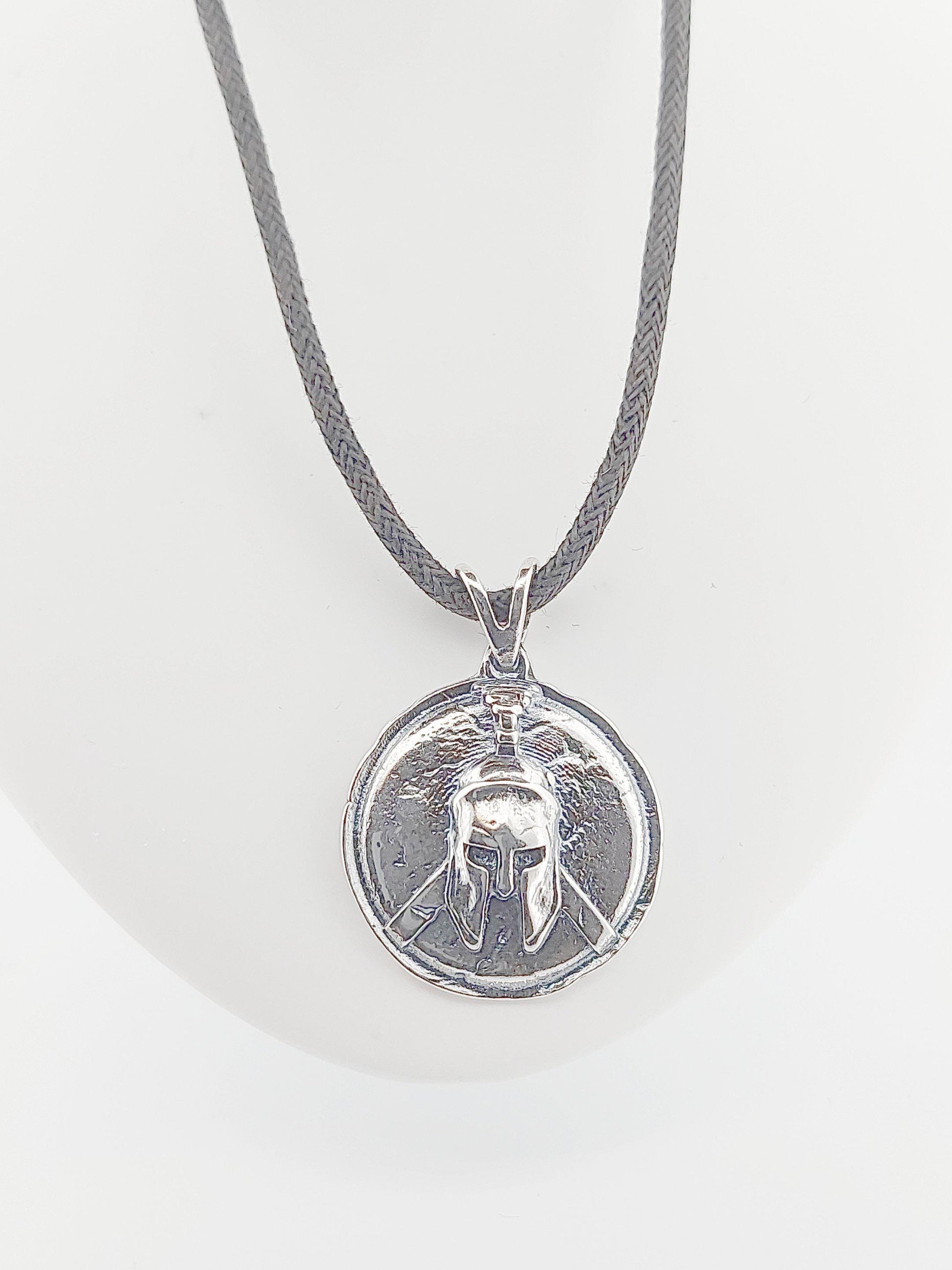 DESIGN: Intricately crafted Spartan helmet and shield pendant featuring detailed metalwork in pure silver finish