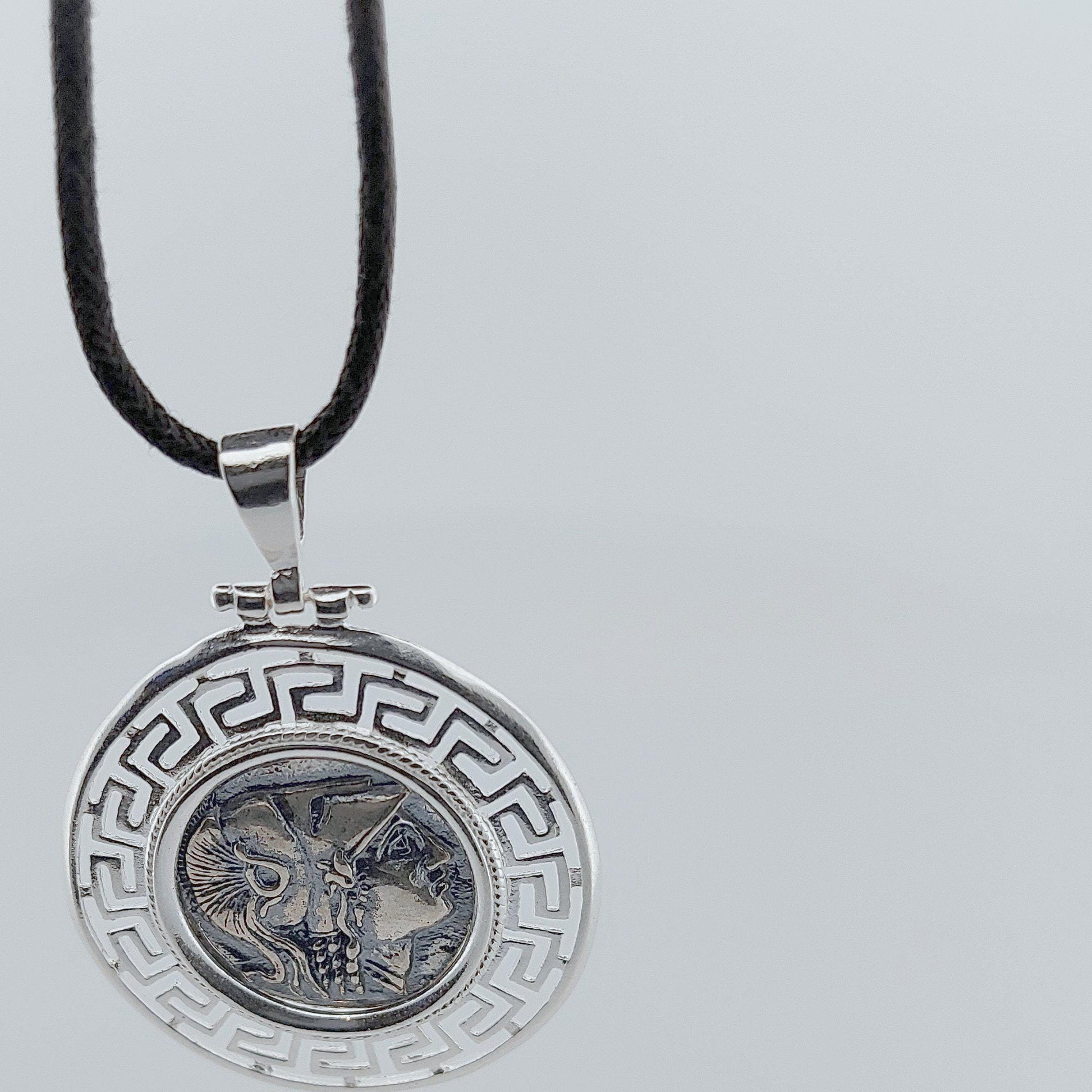 This stunning silver pendant features the iconic Goddess Athena design, beautifully framed by an elegant Greek key pattern border. The intricate medallion showcases detailed artistry with Athena's profile surrounded by classical Hellenic motifs.