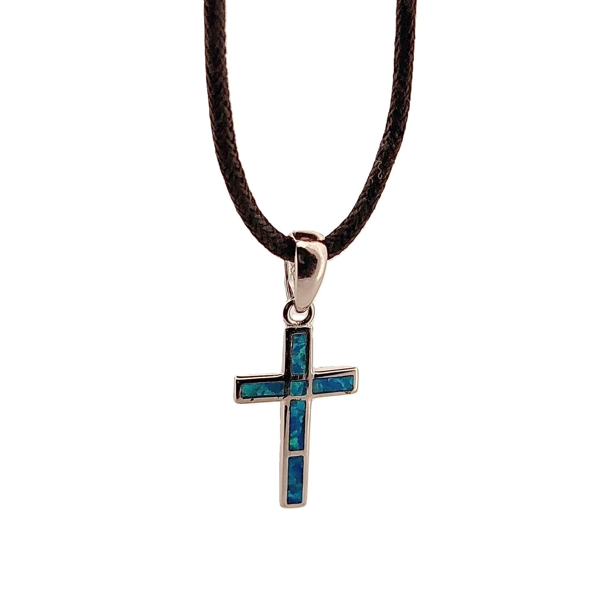 DESIGN: Elegant cross pendant crafted in sterling silver, featuring vibrant blue opal inlay arranged in a classic cross pattern