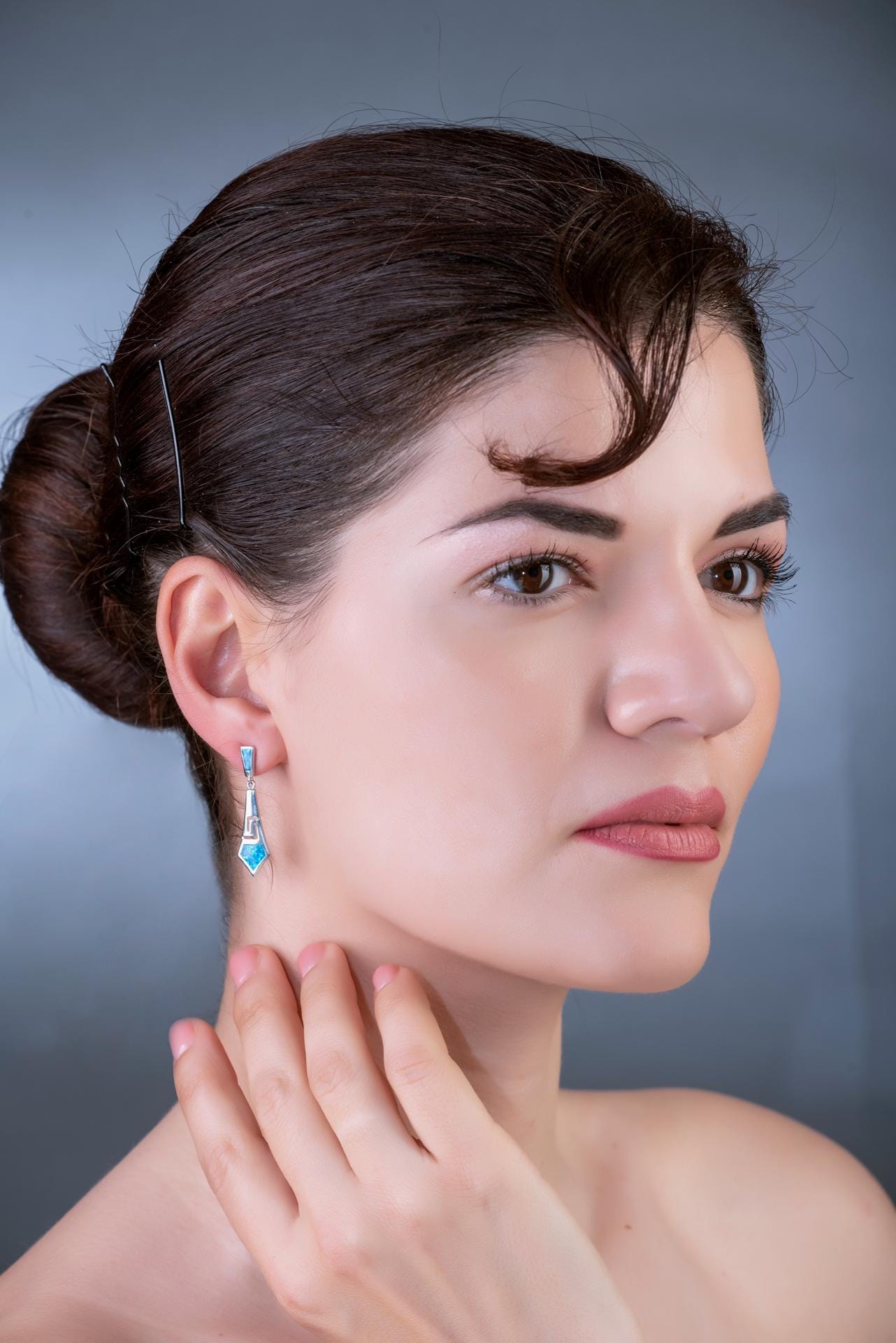 Add a touch of ancient Greek elegance to your jewelry collection with these stunning Sterling Silver Blue Opal Dangle Earrings. The distinctive design features the iconic Greek Key (Meander) pattern, symbolizing the eternal flow of life and unbreakable bonds. Each earring showcases vibrant blue opal inlays that catch and reflect light beautifully, set against oxidized sterling silver for enhanced contrast. The medium-sized earrings are expertly crafted in Greece, combining traditional artistry with contemporary style. These lightweight 3-gram earrings are perfect for both casual wear and special occasions, making them a versatile addition to any outfit. The 925 sterling silver construction ensures lasting quality and durability. The dangle design measures approximately 1 inch in length, creating an eye-catching movement that draws attention to your face. These earrings arrive as a matching pair, ready to become your new signature accessory. Please note that these earrings contain small parts.
