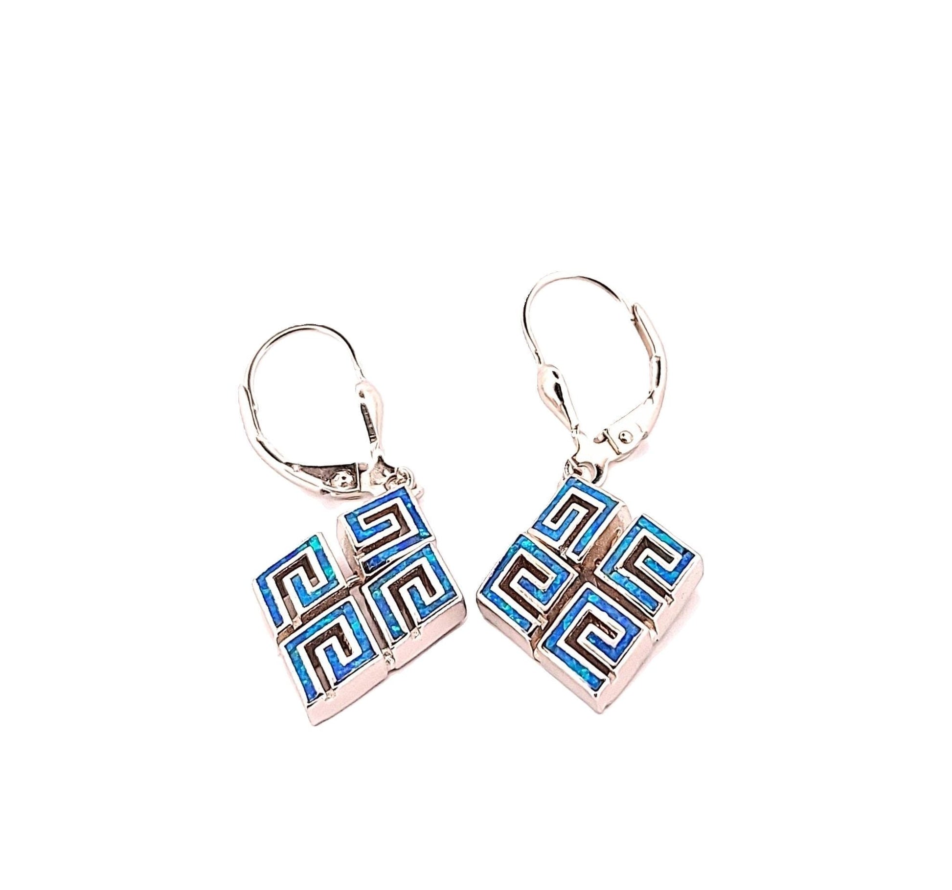AUTHENTIC DESIGN: Sterling silver earrings featuring a diamond-shaped Greek key meander pattern inlaid with vibrant blue opal, symbolizing eternal flow and timeless bonds
