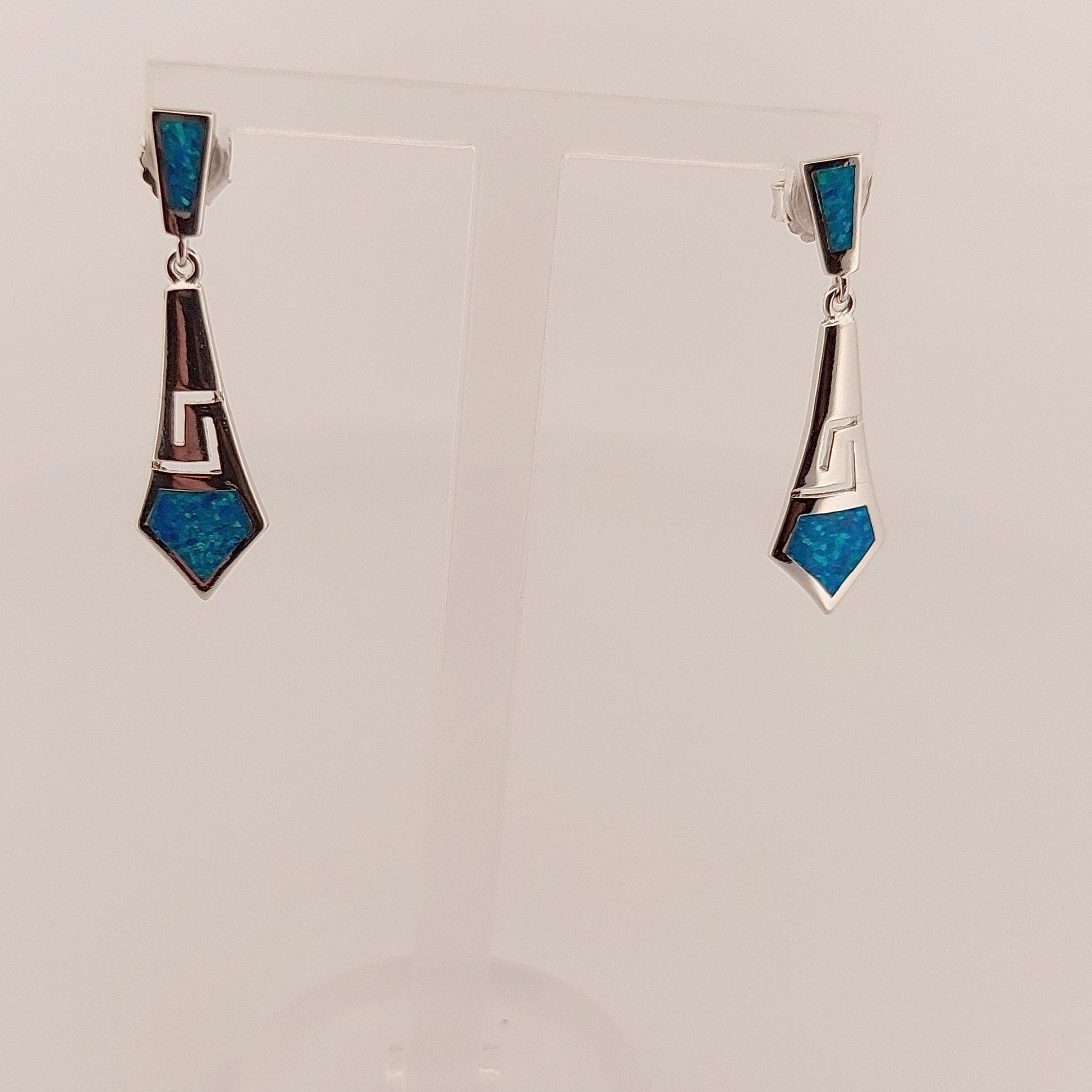 Sterling Silver Blue Opal Dangle Earrings: Greek Key Diamond Design