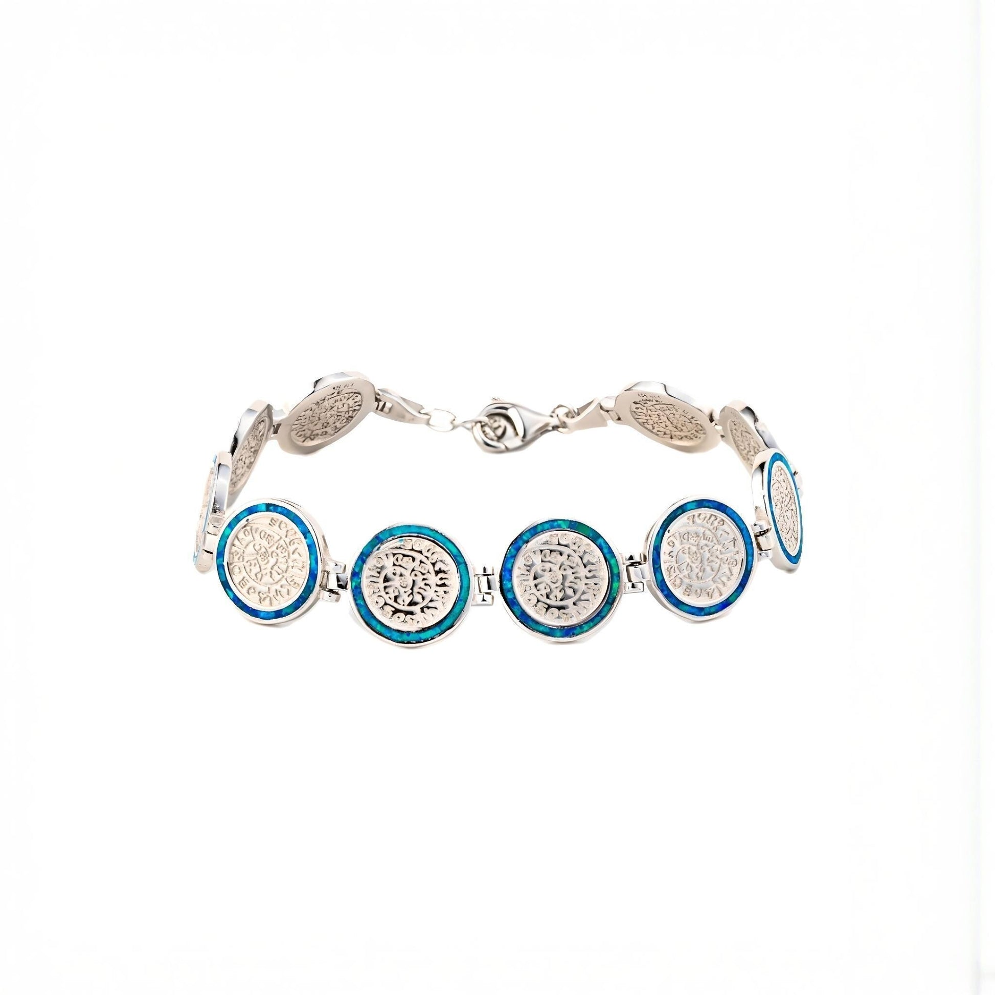 The bracelet combines historical significance with contemporary style, featuring precisely crafted disc medallions connected in an elegant link design. The iridescent blue opal border creates a striking contrast against the silver relief patterns, making this piece both a conversation starter and a sophisticated accessory.