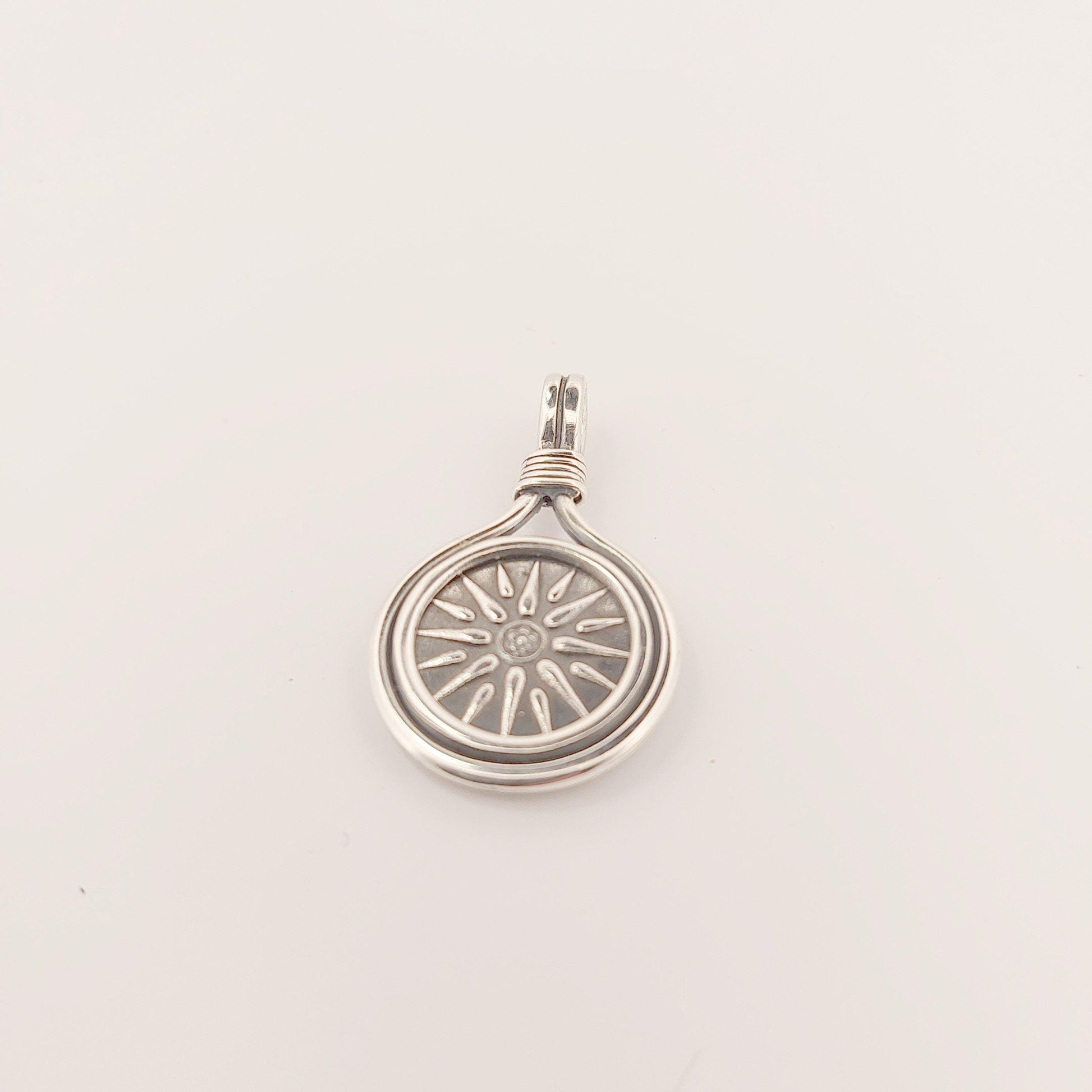 CRAFTSMANSHIP: Intricately detailed silver pendant with a circular frame and wire-wrapped bail, showcasing traditional Greek metalworking techniques